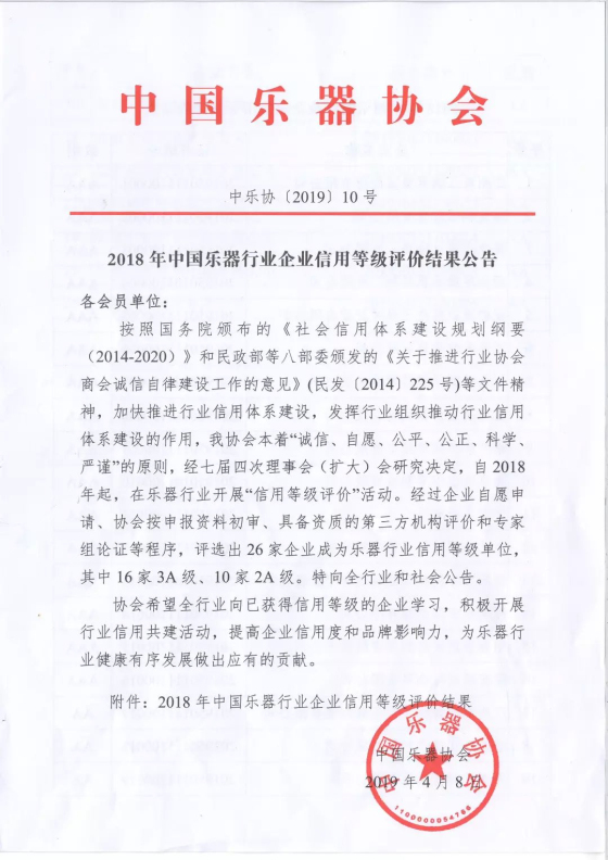 2018年中國樂(lè )器行業(yè)企業(yè)信用3A級企業(yè)