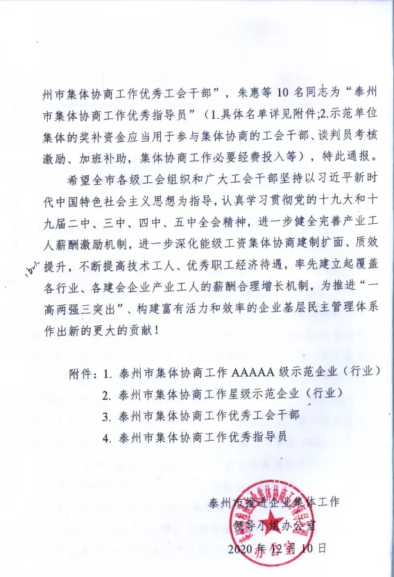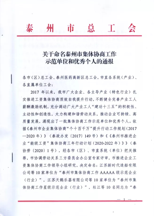 多年以來(lái),天鵝樂(lè )器始終堅持工資集體協(xié)商,不斷健全完善工人薪酬激勵機制,致力于調動(dòng)工人的積極性、主動(dòng)性和創(chuàng )造性,大力構建和諧勞動(dòng)關(guān)系,推動(dòng)企業(yè)的可持續發(fā)展、高質(zhì)量發(fā)展。2020年11月,泰州市總工會(huì )、泰州市人力資源和社會(huì )保障局、泰州市工業(yè)和信息化局、泰州市工商業(yè)聯(lián)合會(huì )聯(lián)合授予天鵝樂(lè )器“泰州市集體協(xié)商工作星級示范企業(yè)(行業(yè))”稱(chēng)號。