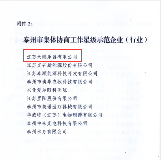 天鵝樂(lè )器被評為“泰州市集體協(xié)商工作星級示范企業(yè)(行業(yè))”
